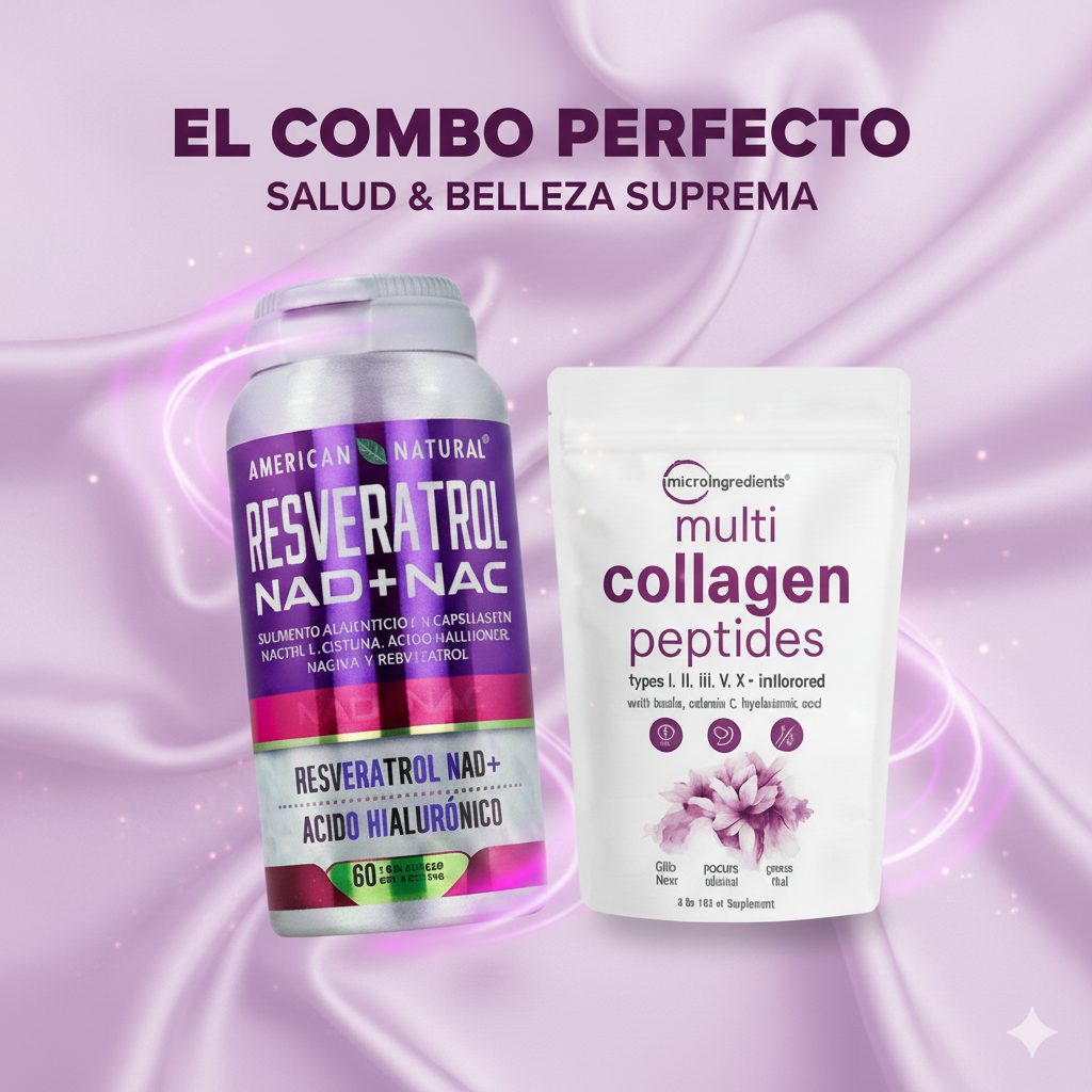 El Combo Rejuvenecimiento Premium combina colágeno de espectro completo + antioxidantes (Resveratrol, NAD+ y NAC) para regenerar tejidos, proteger tus células y devolverle a tu cuerpo fuerza, energía y juventud desde adentro.
