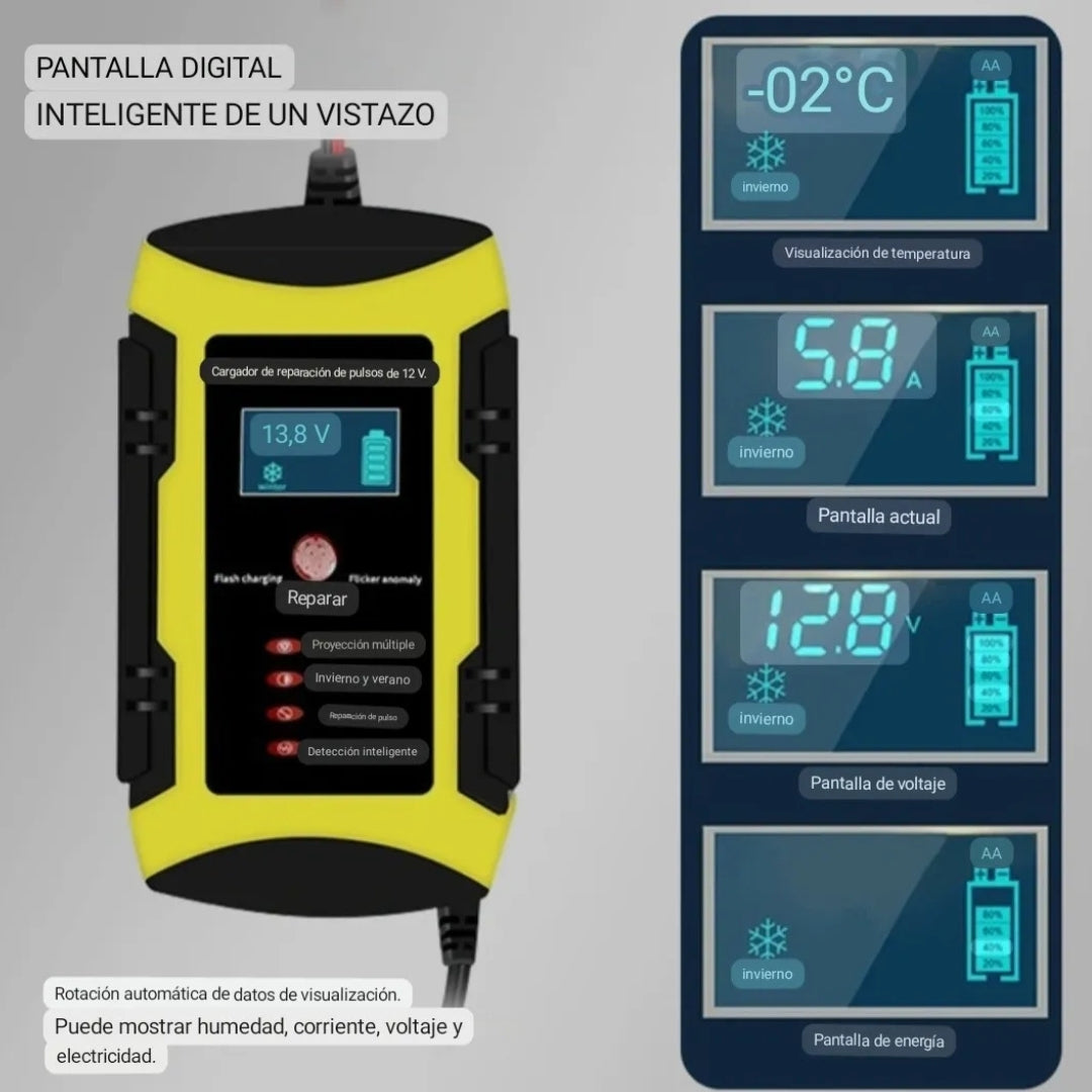- Pantalla LCD Digital: Información en tiempo real del estado de la batería y el progreso de la carga.