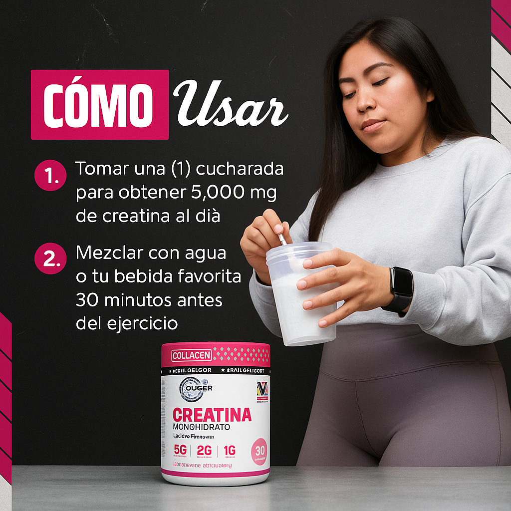 - Ingredientes por porción: Creatina Monohidratada 5 g-Colágeno Hidrolizado 2 g-BCAA 2:1:1 1 g
