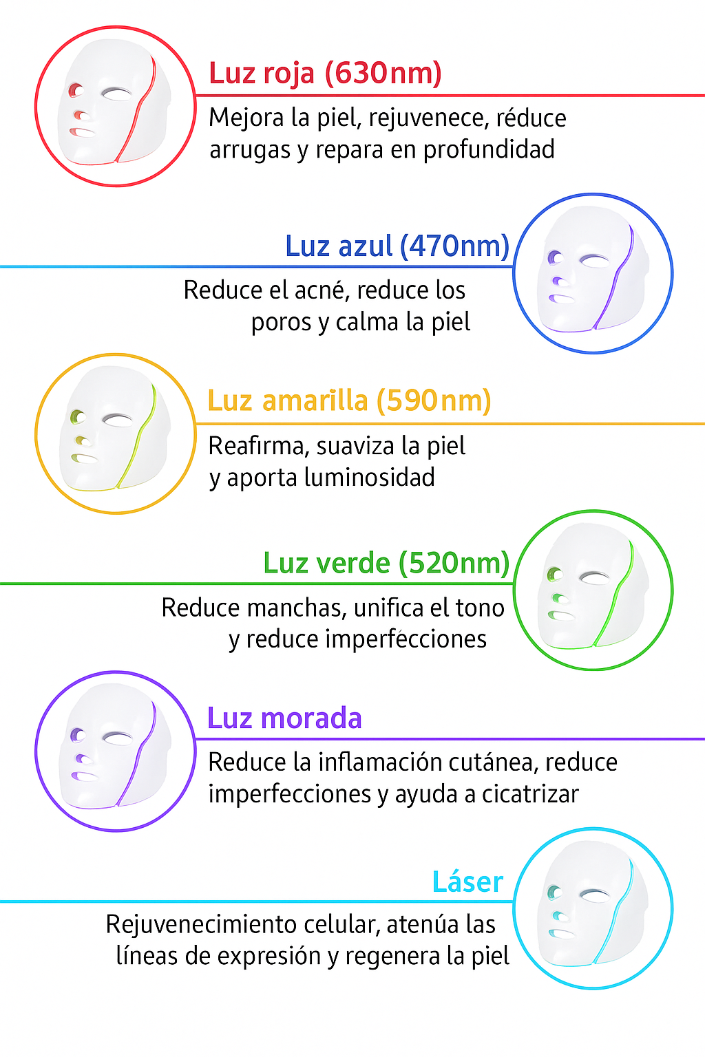 🌈 Terapia Multicolor: 7 colores LED que se adaptan a distintas necesidades de cuidado facial.