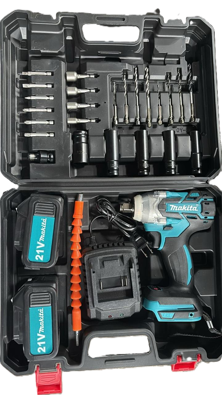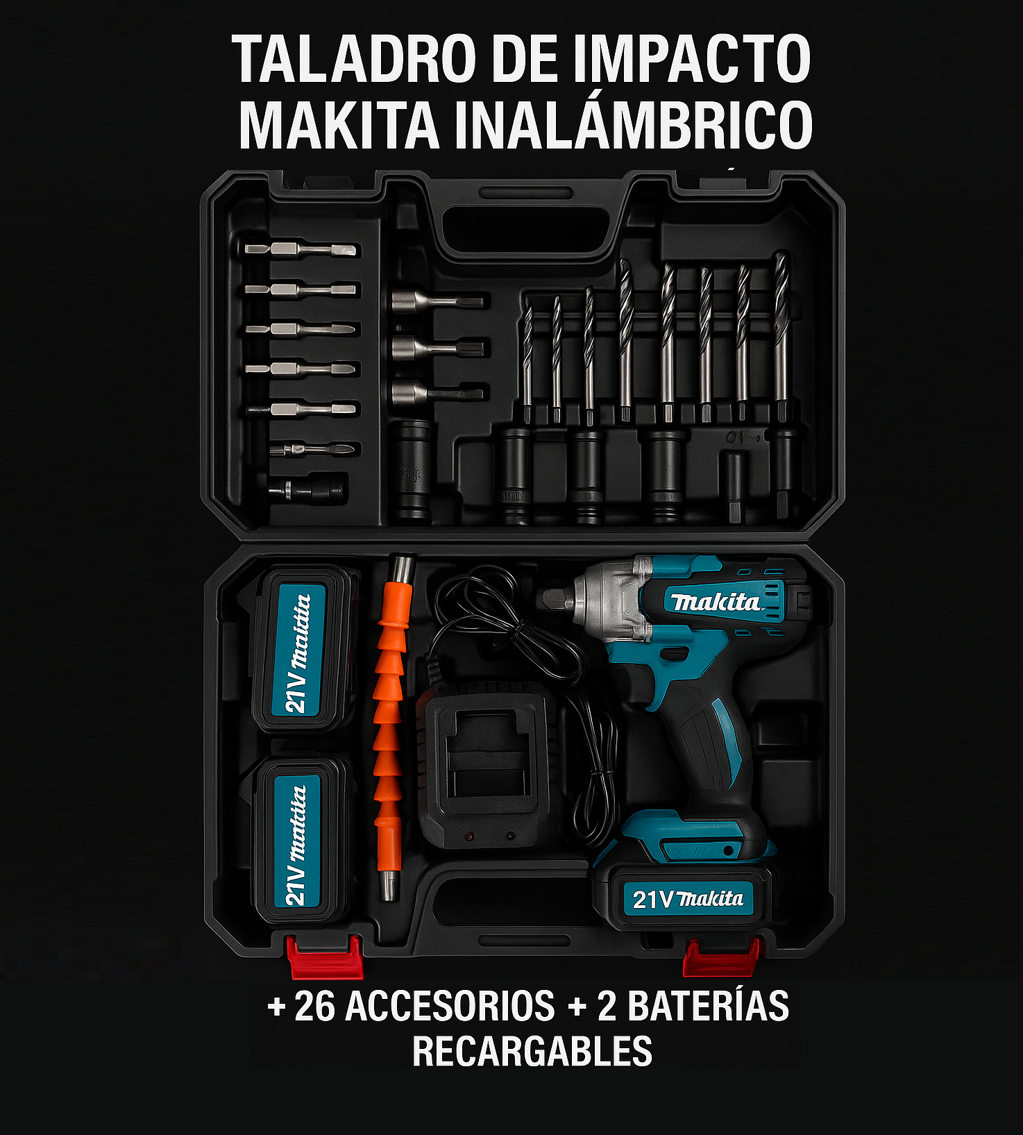 Kit Makita: Taladro de Impacto + 26 accesorios + 2 baterías.