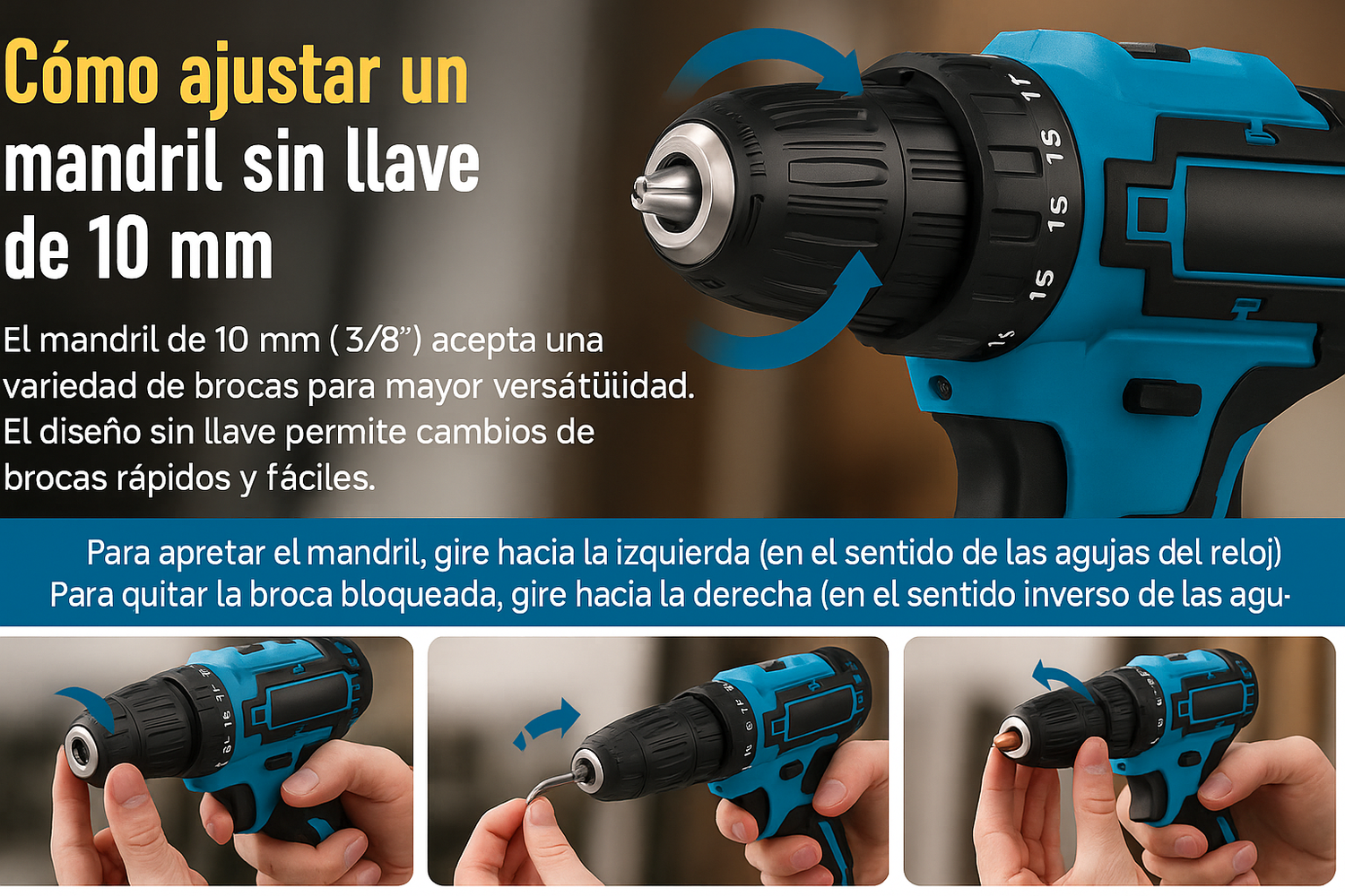 Sí. Cuenta con un mandril metálico y una modalidad sin llave que facilita el cambio rápido de brocas y puntas. Además, la función "3 en 1" incluye modos de percusión, atornillado y perforación, adecuados para distintos materiales