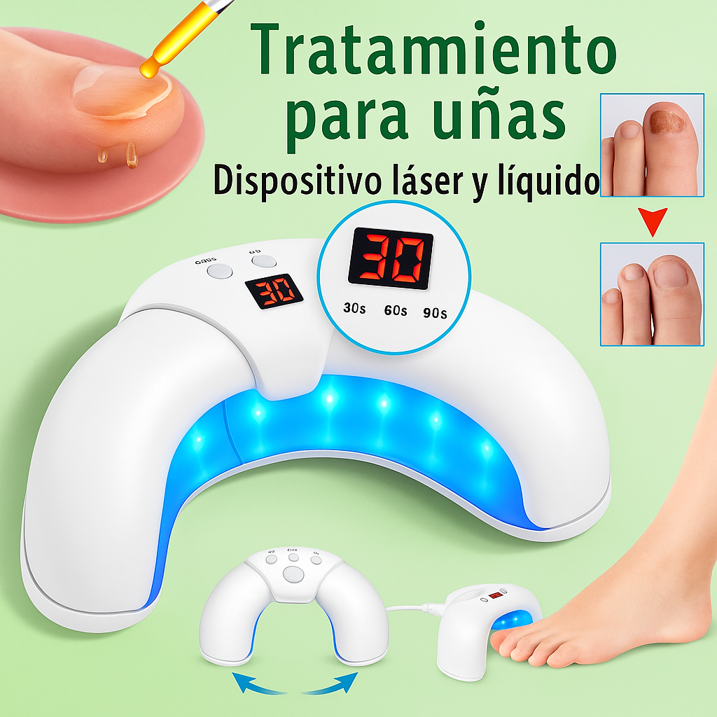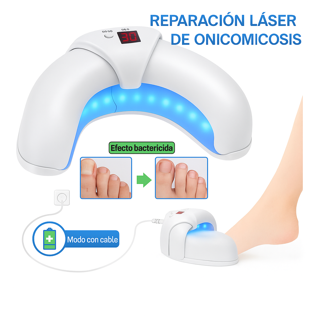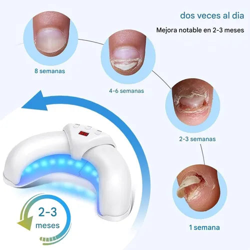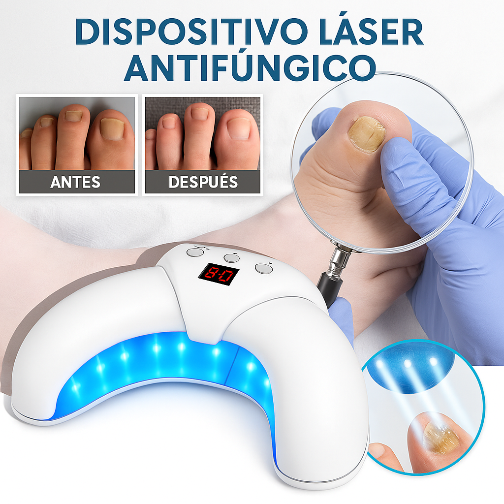 - Diseñado para eliminar de raíz las infecciones fúngicas en manos y pies. Este dispositivo ofrece un tratamiento seguro, indoloro y sin químicos, fortaleciendo las uñas frágiles y devolviendo su aspecto saludable y natural en pocas semanas.