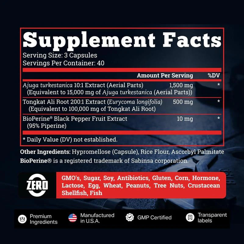Turkesterone (derivado de la planta Ajuga turkestanica) activa la síntesis de proteínas y promueve el desarrollo muscular sin interferir con la testosterona.