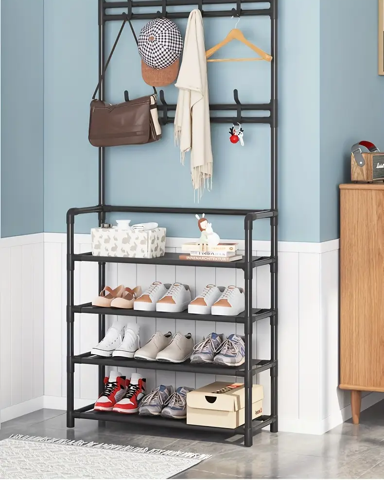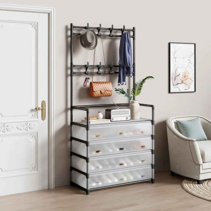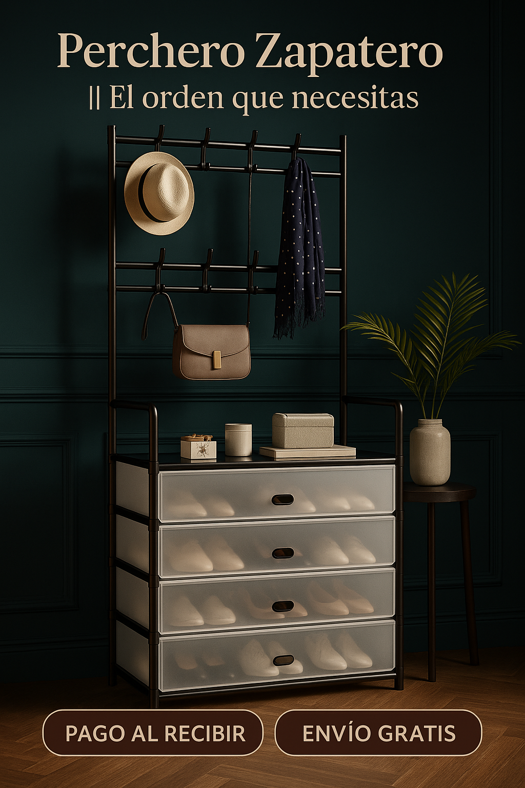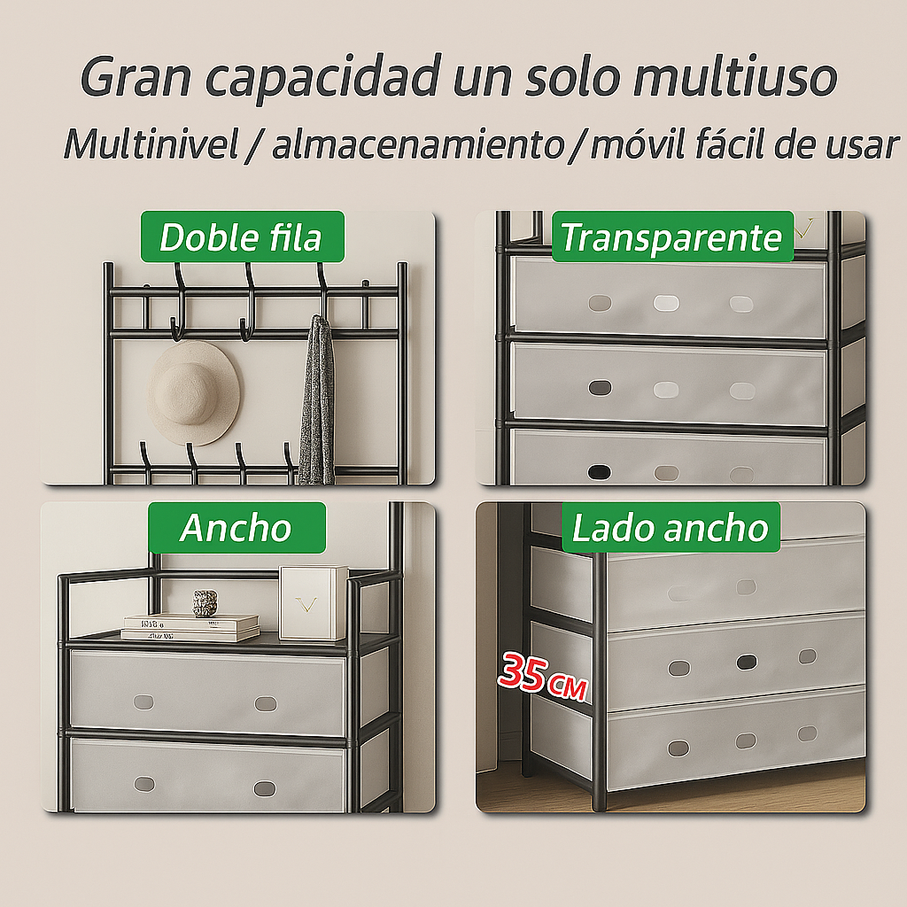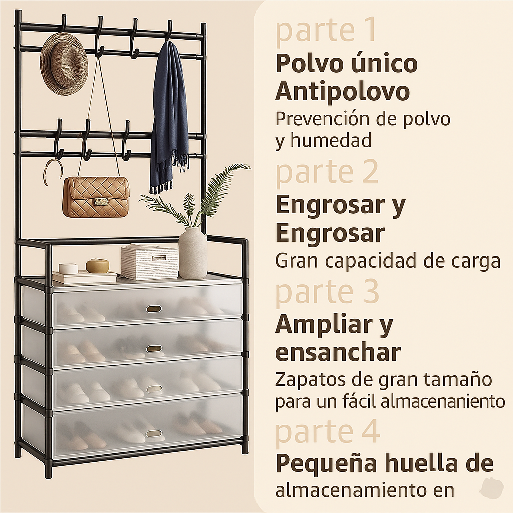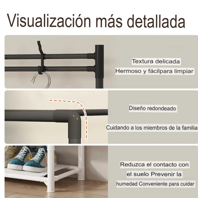 - El Perchero Zapatero 2 en 1 organiza todo en un solo lugar con funda antipolvo y estructura resistente.